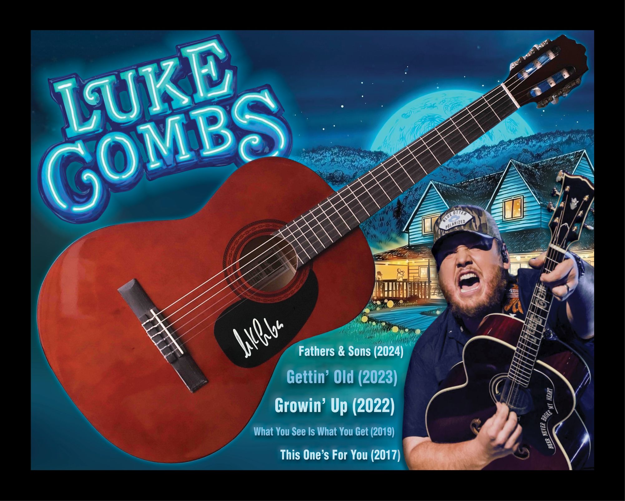 Signed acoustic guitar framed with custom designed matboard. The biggest star in Country Music, Luke Combs has brought Country into the mainstream. With a string of awards and hits to his credit already, performance like his famous cover of ‘Fast Car’ have only cemented his place at the top.