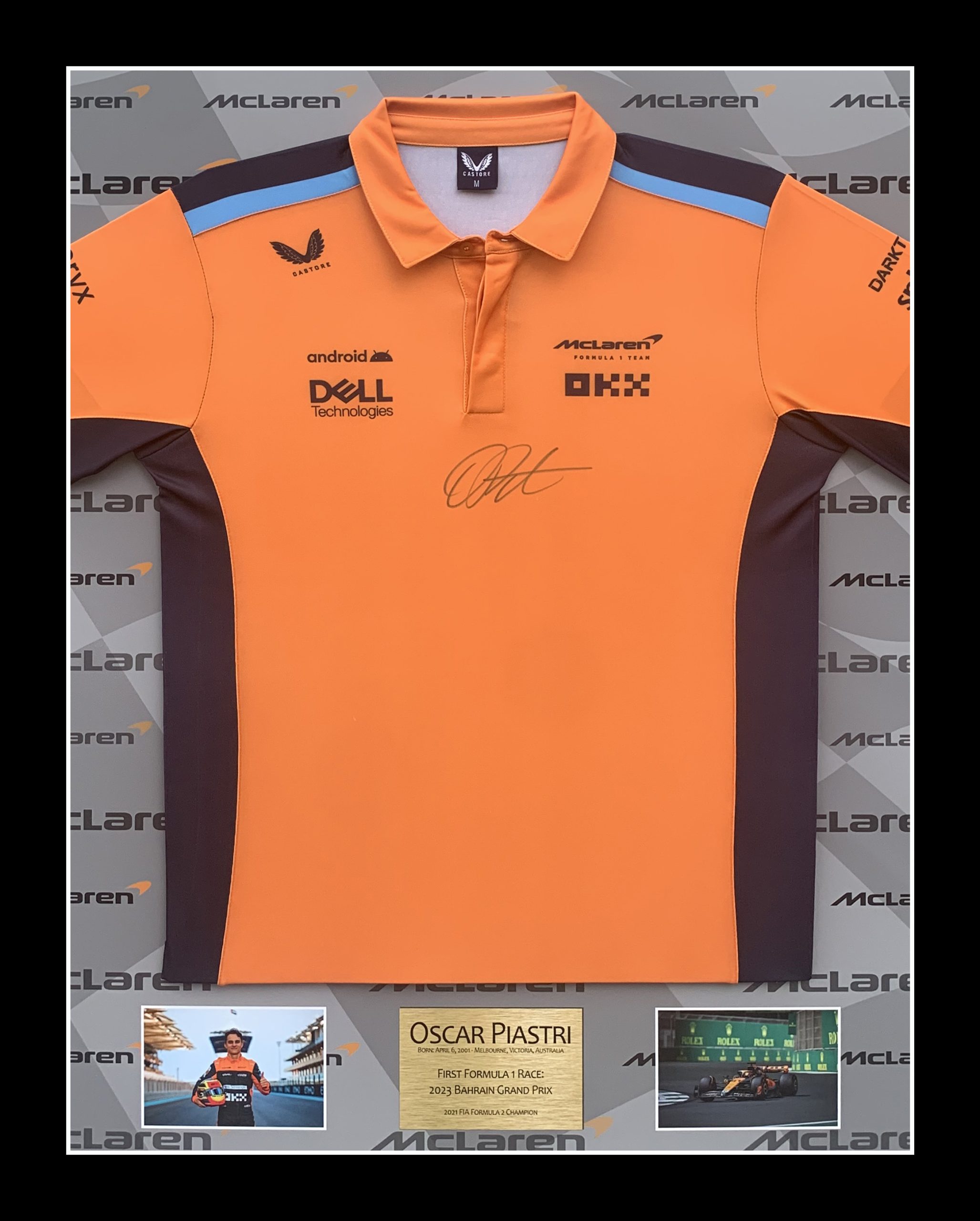 Signed F1 shirt on a custom matboard. The latest Australian superstar in F1, and the first F1 driver in history born in the 21st century. Winner of both the F3 and F2 championships on the way to the top class, Piastri is an F1 World Champion in the making.