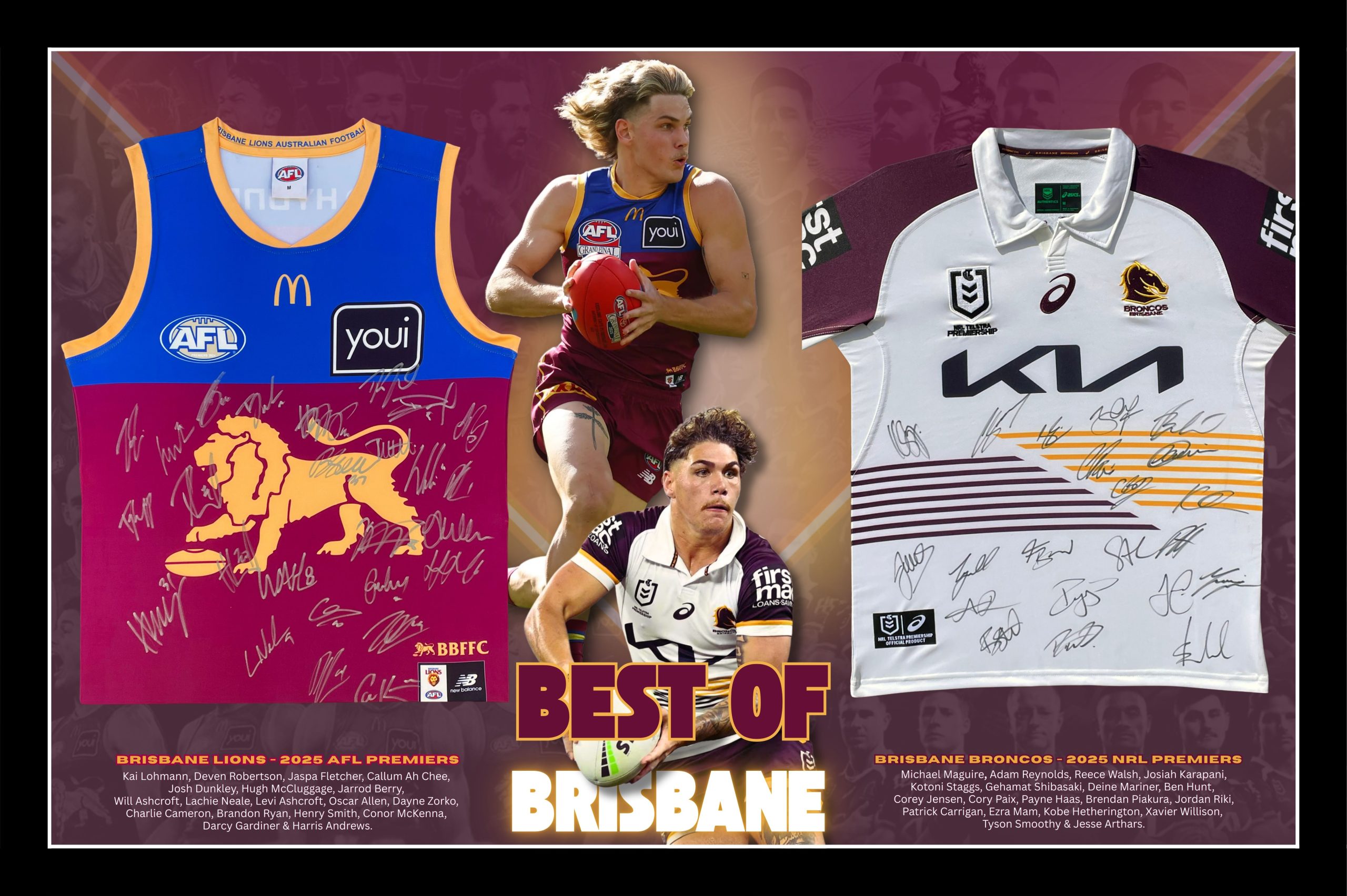 2025 NRL and AFL Premiership jerseys, framed together as an unprecedented collectable. Brisbane achieved the rare feat of winning both the NRL and AFL Grand Finals in 2025, and this piece celebrates the players who made it happen – Reece Walsh, Will Ashcroft, Adam Reynolds, Lachie Neale, Payne Haas, Harris Andrews and many more!